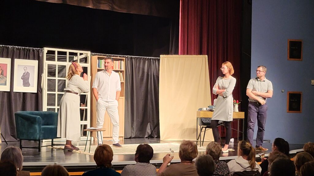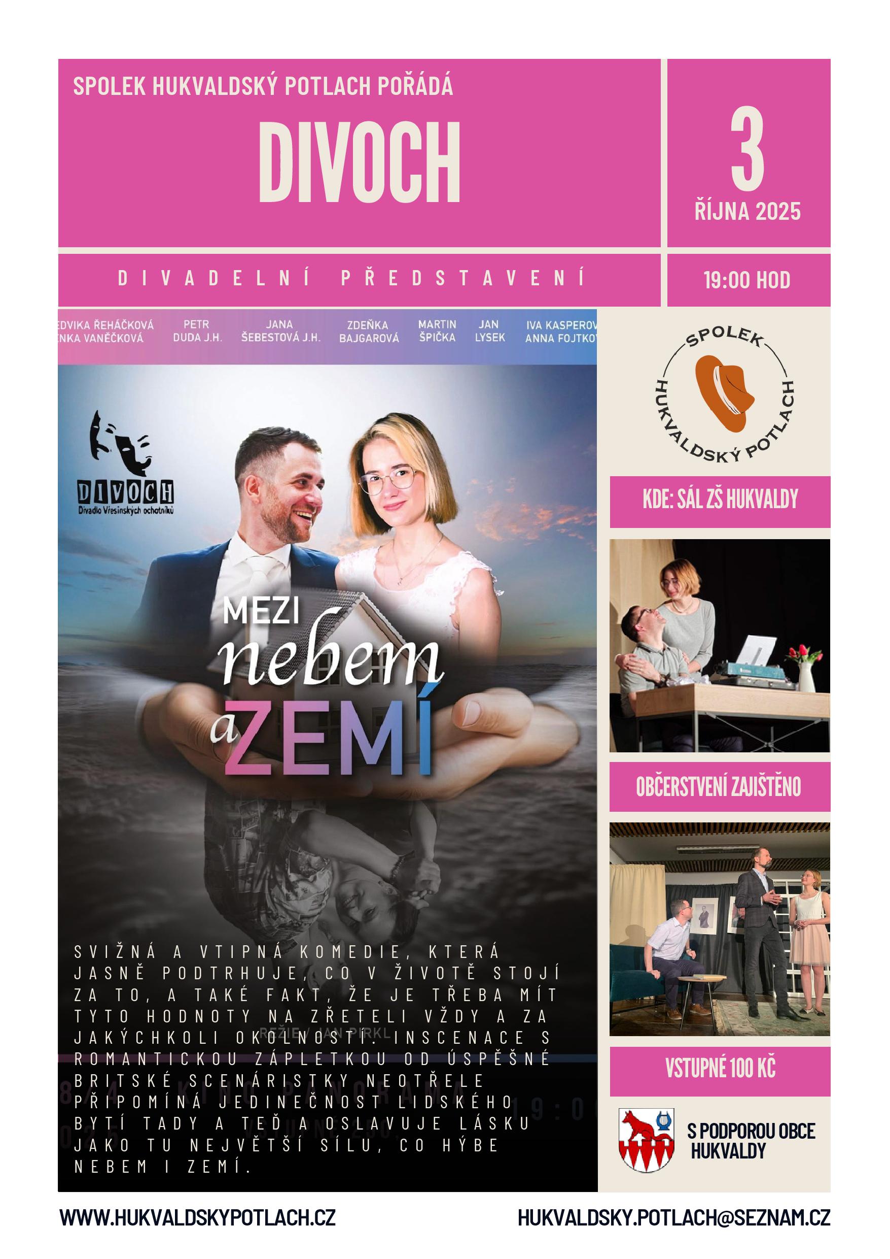 Tak tohle nás baví přátelé. Zaplněné hlediště školního sálu na Hukvaldech, spokojení diváci, nadšení herci. Co víc si přát. Vždy když pořádáme divadlo, nevíme dopředu, zda se divadelní hra bude divákům líbit, jestli nešlápneme vedle. Ale podle ohlasů od diváků i od herců se nám daří vybírat divadelní hry, které baví a táhnou. Ochotnické divadelní spolky z regionu – to je záruka kvalitní kultury, kvalitní zábavy. A to platí i o divadle Divoch z Vřesiny, které nás maximálně pobavilo s krásnou komedií Mezi nebem a zemí.