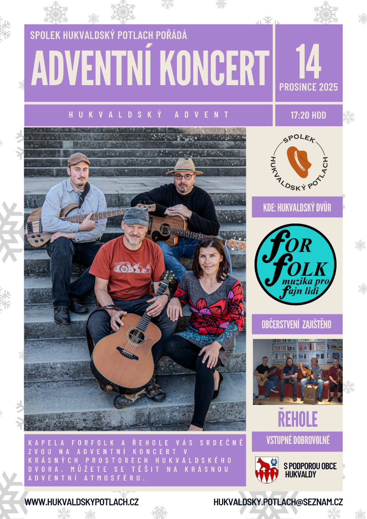 V hudební náladě můžete pokračovat také na Adventním koncertu v neděli 14.prosince od 17.20 hod. Těšit se můžete na kapely ForFolk a Řehole.